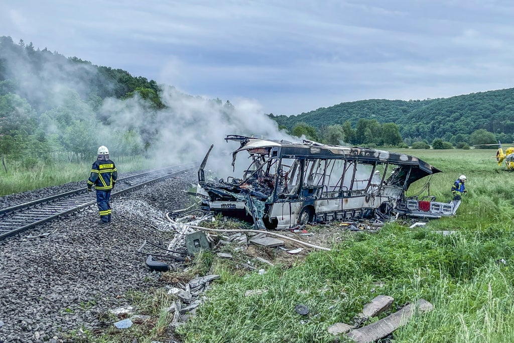 The bus driver was thrown from the vehicle and severely injured. The driver and several passengers on the train were also injured. The bus caught fire and was left entirely burned out.