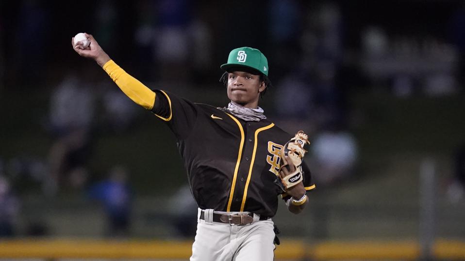 San Diego Padres shortstop C.J. Abrams throws during a spring training baseball game against the Chicago Cubs Wednesday, March 17, 2021, in Mesa, Ariz. (AP Photo/Ashley Landis) ASSOCIATED PRESS