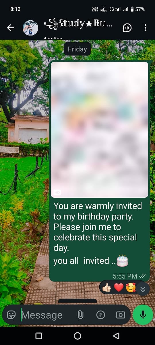 On December 26, Shivangi sent the invite to her class WhatsApp group, which has 40 members. “You are warmly invited to my birthday party,” she wrote. “Please join me to celebrate this special day. You all invited..”