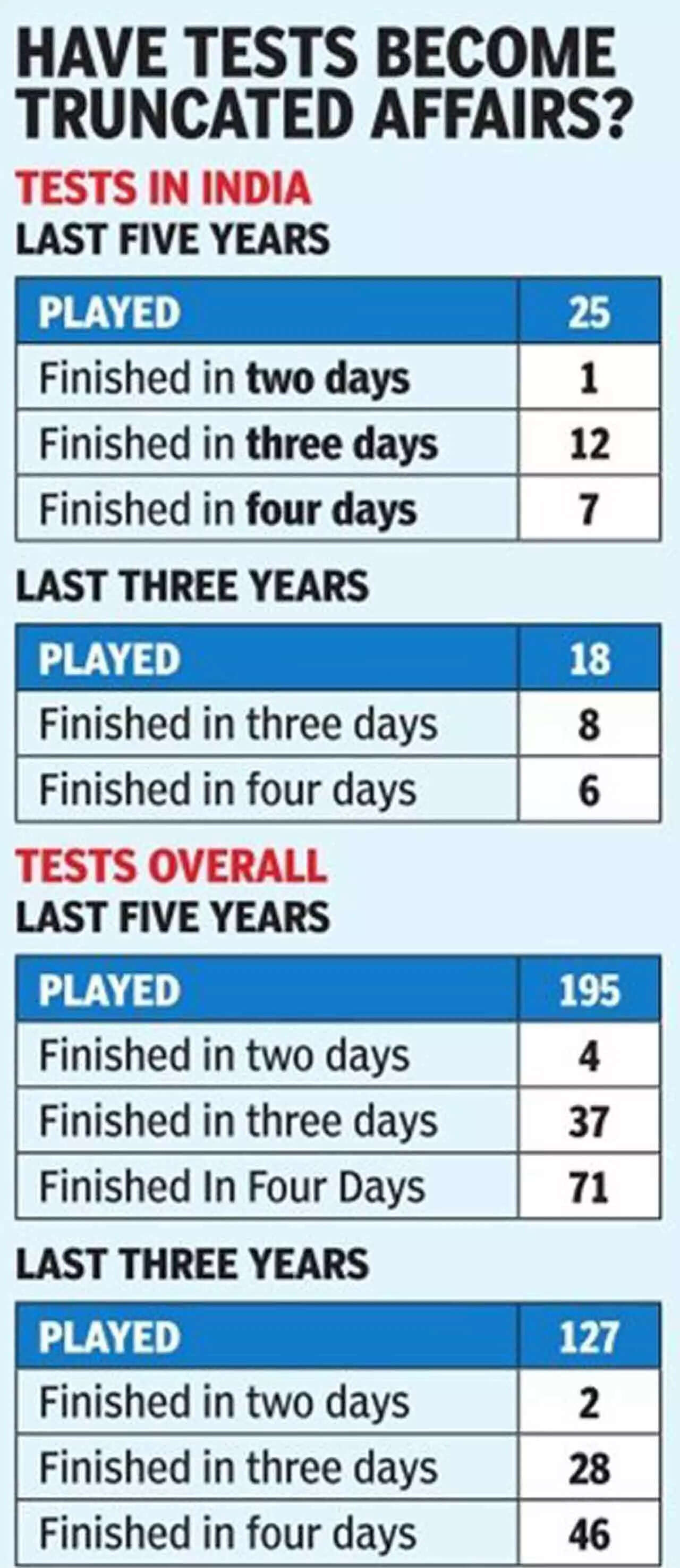 With home teams gunning for wins that will land them precious points for a place in the World Test Championship (WTC) final, Tests are struggling to last the duration. Mostly these Tests are played either on spin-friendly pitches in the subcontinent or fast and bouncy wickets in SENA countries. Of 25 Tests played in India in the last five years, 12 finished inside three days, seven within four days, and one match - the third (pink ball) Test between India and England in Ahmedabad - was over in just two days.
