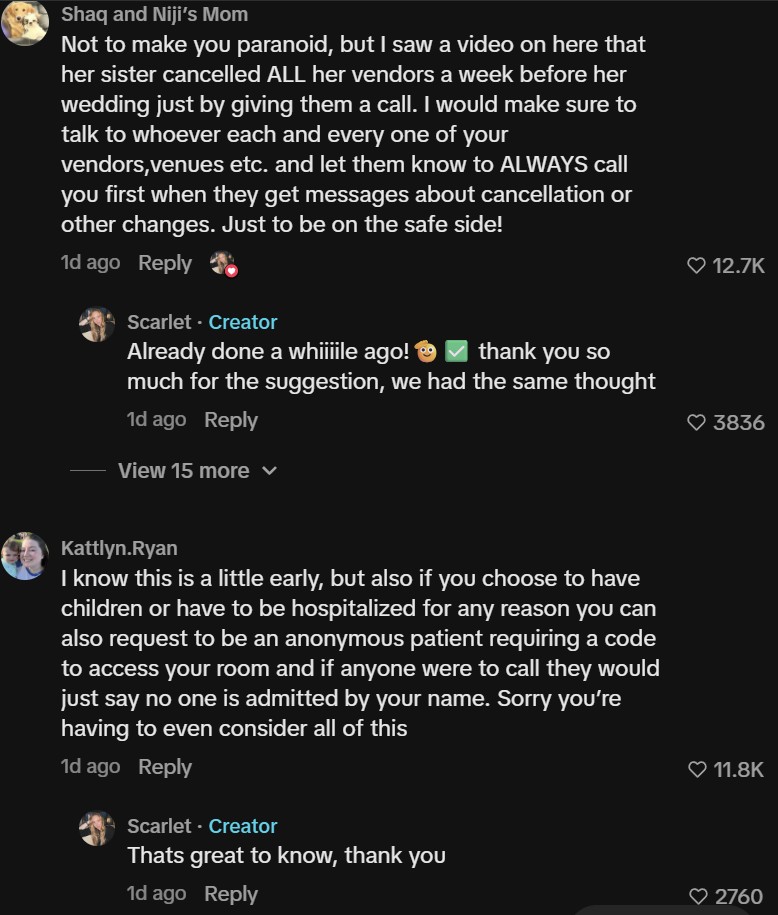 When Scarlet began sharing her upbringing stories online and mentioned her upcoming wedding, many followers suggested she get security for the big day. She admitted it felt a bit “over the top” at the time. Unfortunately, that feeling has changed. As her wedding nears, her family has created fake accounts to lurk on her public TikTok and Instagram, testing the boundaries she has tried to set.