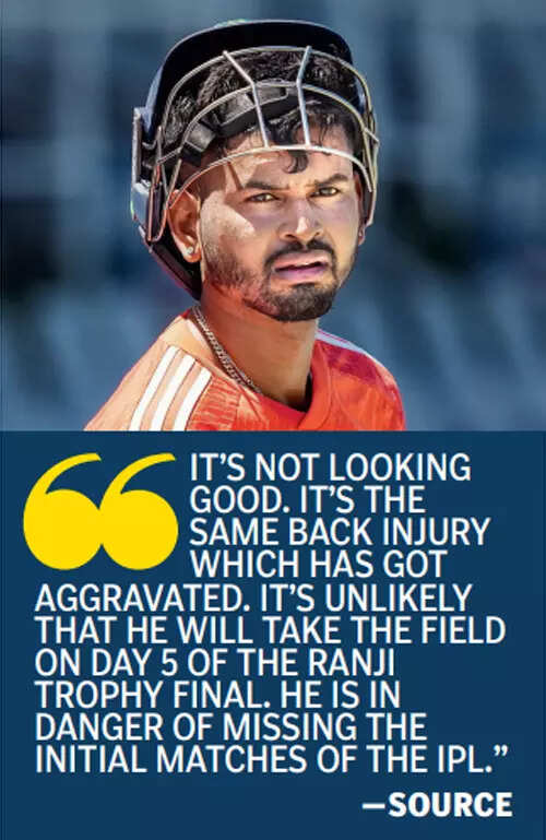 During his 111-ball knock on Tuesday, Iyer had to twice seek treatment from the Mumbai physio for back spasms. On Wednesday, Day Four of the Ranji Trophy final, the 29-yearold couldn’t take the field for the entire day. TOI has learnt that Iyer went to a hospital for a scan of his back.