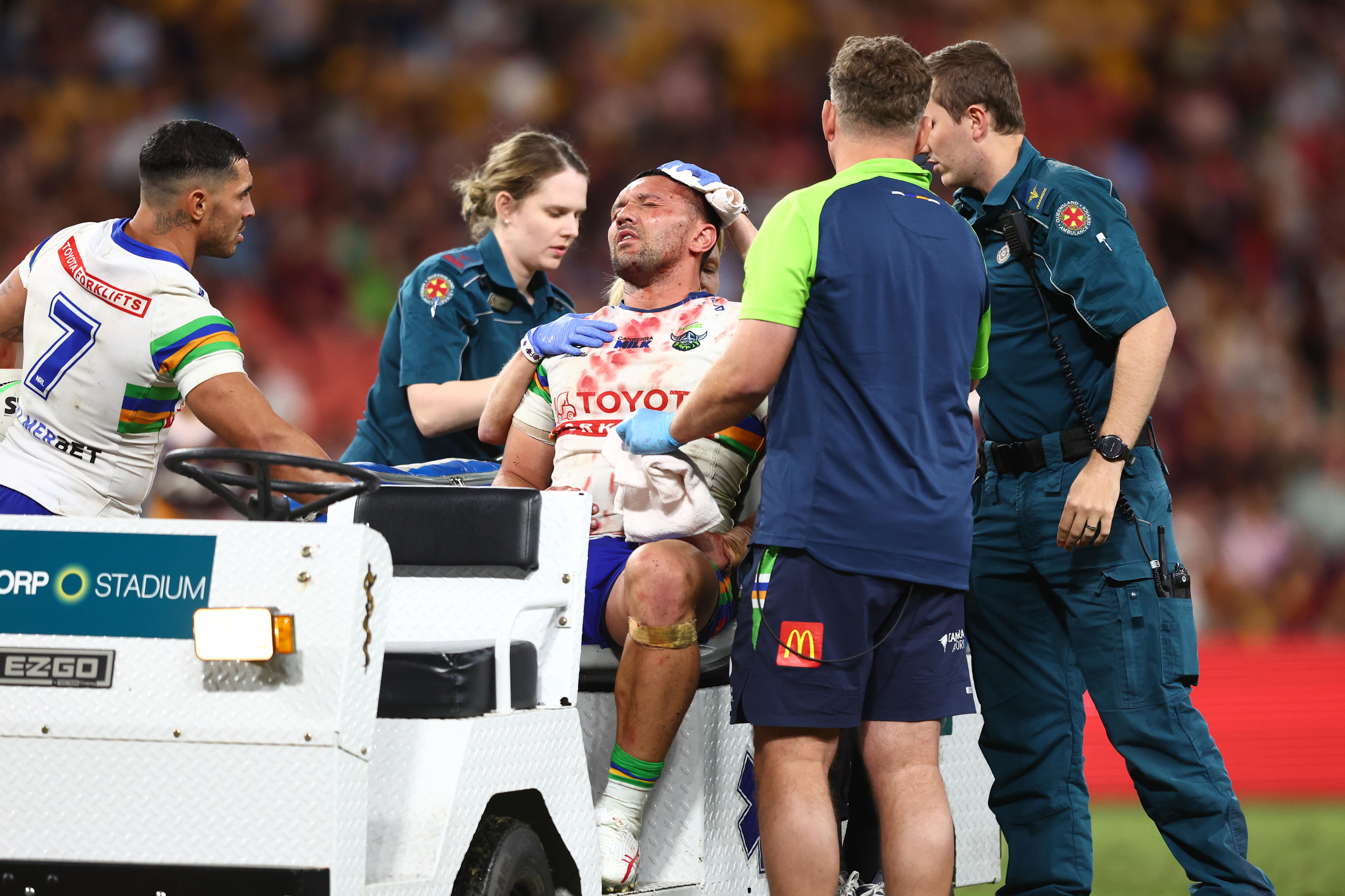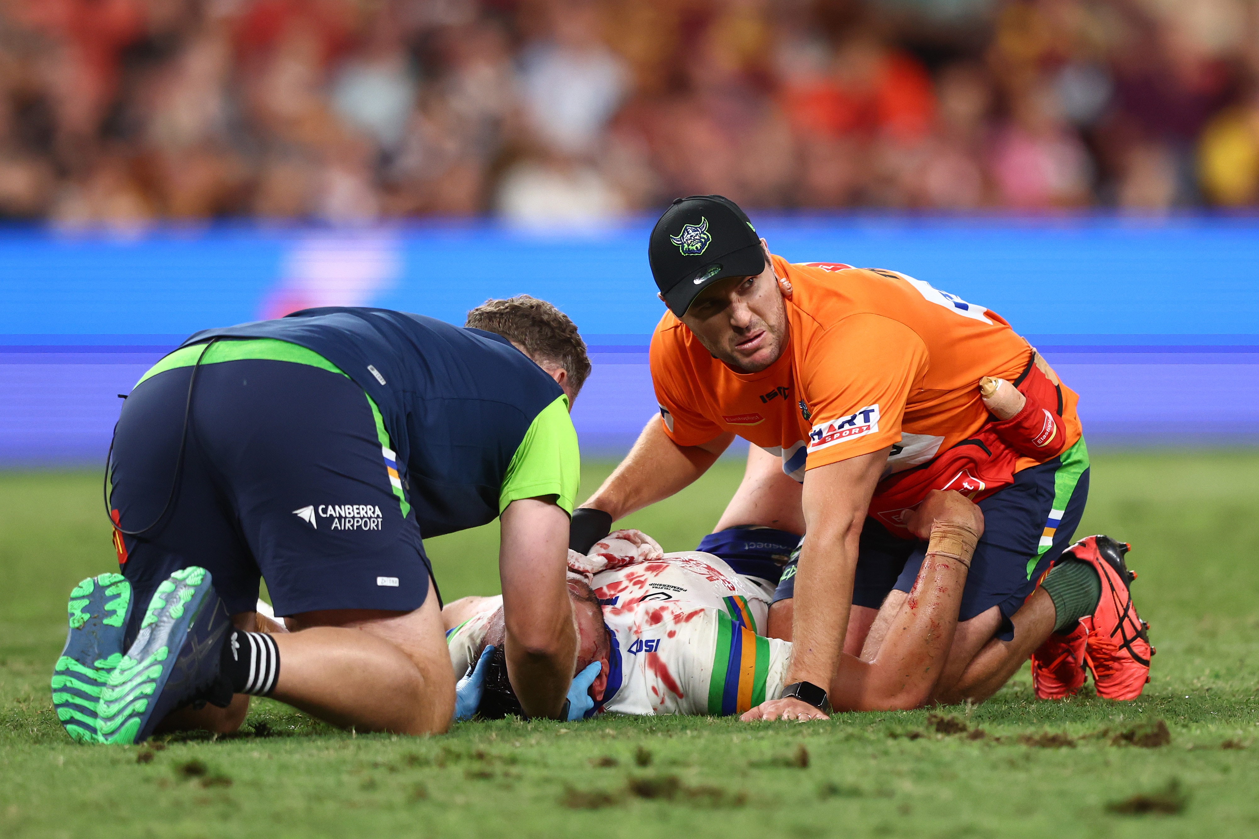 The incident appeared relatively innocuous in real time, but the gruesome aftermath soon became apparent when blood poured onto the Lang Park turf, leaving Rapana in considerable distress.