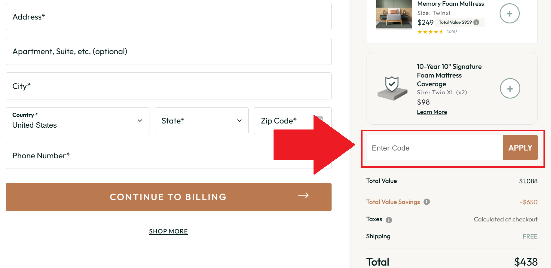 - Above the order summary (on the right), you'll see a box labeled "Enter Code."