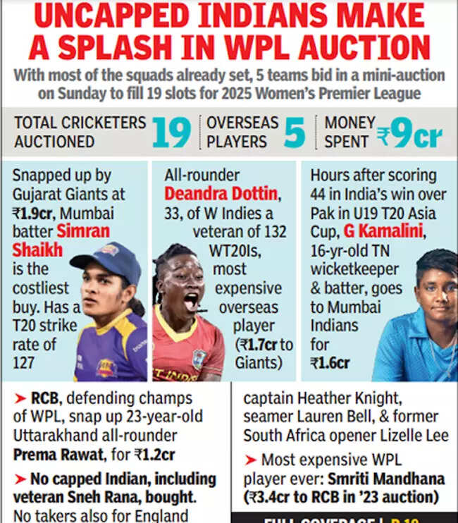 BENGALURU: After an underwhelming inaugural Women’s Premier League season with UP Warriorz, Simran Shaikh watched the previous edition of the competition as a spectator. Going unsold in last season’s auction, the 22-year-old all-rounder went back to the drawing board and delivered for Mumbai in the domestic season. She reaped the rewards to become the most expensive buy at the mini auction held here on Sunday.