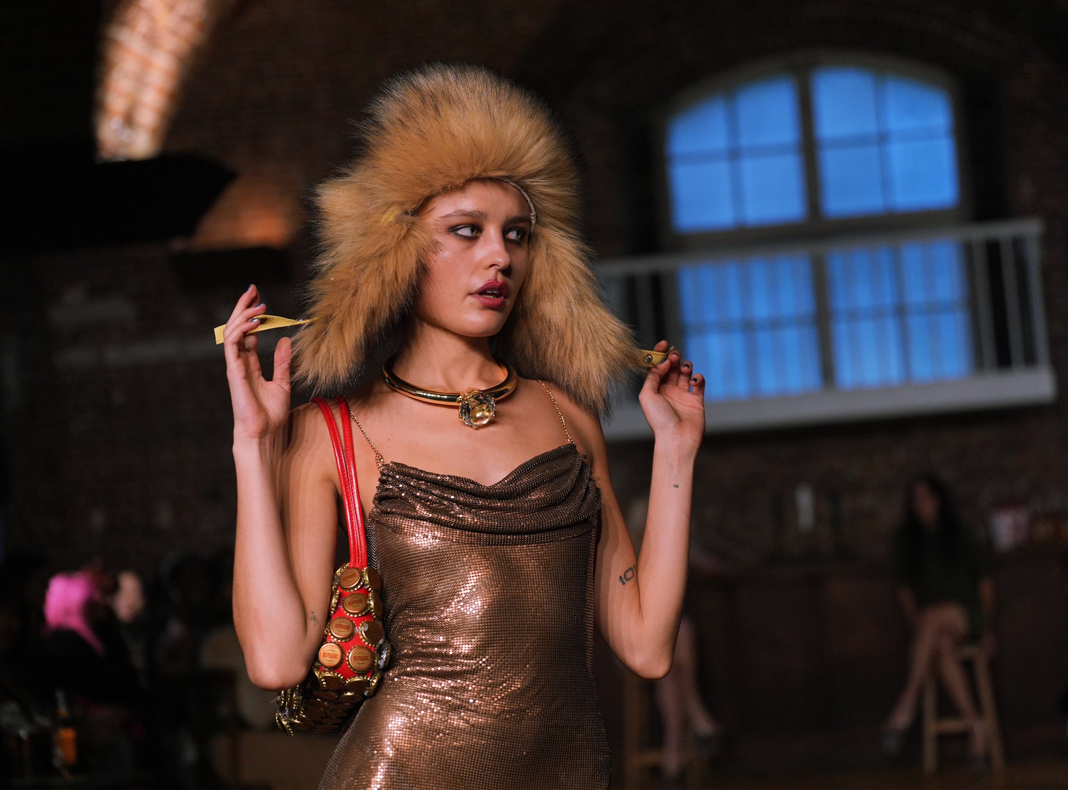 Exposed zips, studs and hardware buckles cut through more romantic elements, while fishnet panels and second-skin layers added a utilitarian edge. Fringe and furry trims – recurring trends across the London schedule – injected texture and movement under the low lighting.