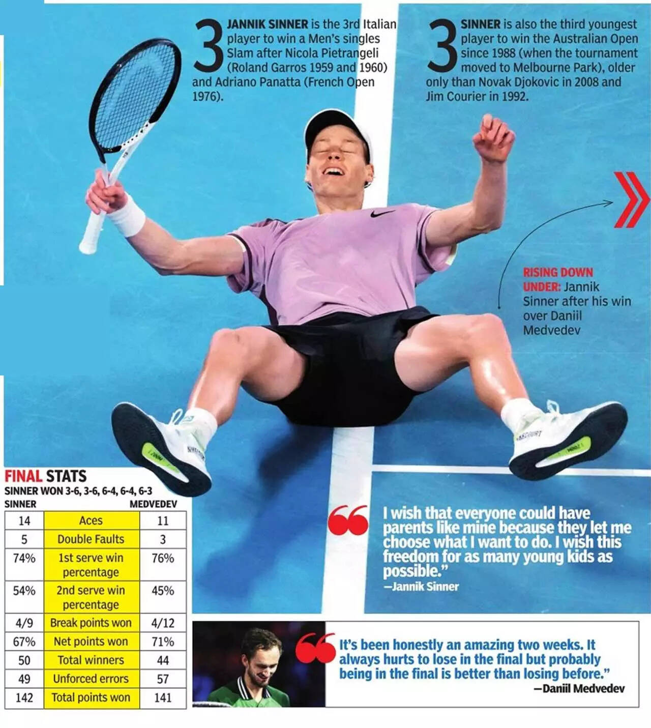 The No.4 seed, the eighth man to comeback from two-sets down to win a Grand Slam final, claimed the Norman Brookes Challenge Cup with a 3-6, 3-6, 6-4, 6-4, 6-3 victory over the third seeded Russian, who won just one point less than Sinner in the total count (141 to 142).