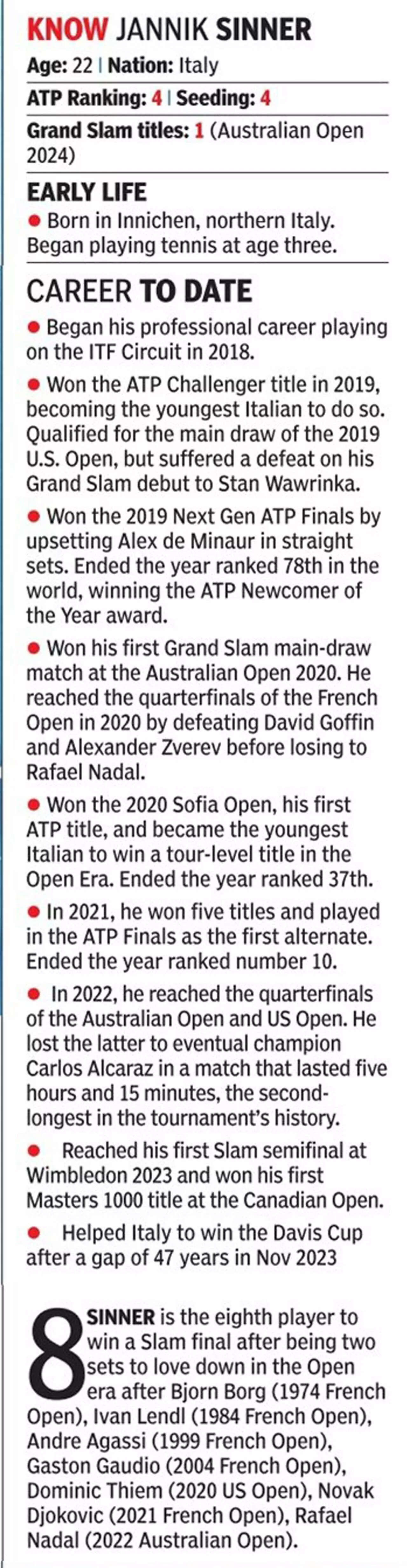 At the presentation ceremony, Sinner said he was delighted to be at the 'Happy Slam". "Where my parents are, it's -20 in the mornings. It's better running in the sun here," he said, before acknowledging the support of his family. "I wish that everyone could have my parents (like mine) because they let me choose what I want to do. When I was younger I played some other sports and they never put pressure on me. I wish this freedom for as many young kids as possible."