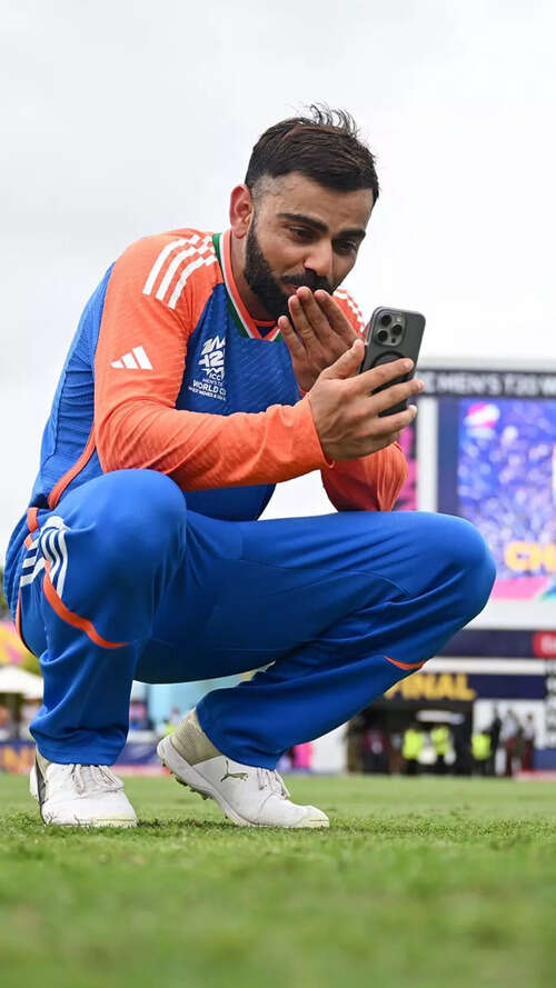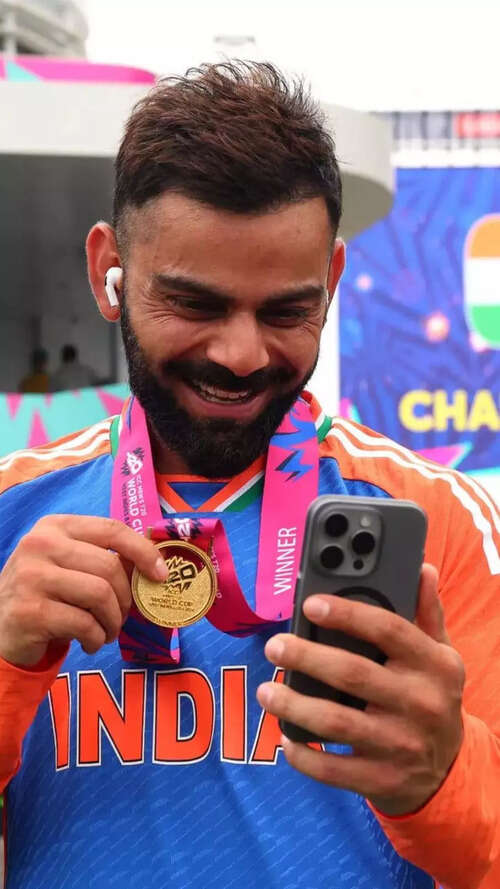 <p>Virat Kohli proudly displaying his World T20 winner's medal over the phone. Kohli was also awarded the Player of the Match for his outstanding innings of 76 runs in the final match.<br /></p>Reuters4/10:Tabriz Shamsi