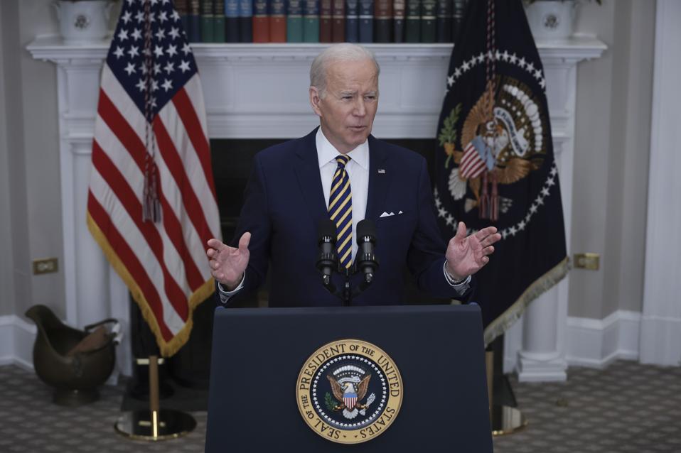 WASHINGTON, DC - MARCH 08: U.S. President Joe Biden speaks in the Roosevelt Room of the White House March 8, 2022 in Washington, DC. During his remarks, Biden announced a full ban on imports of Russian oil and energy products as an additional step in holding Russia accountable for its invasion of Ukraine. (Photo by Win McNamee/Getty Images) Getty Images