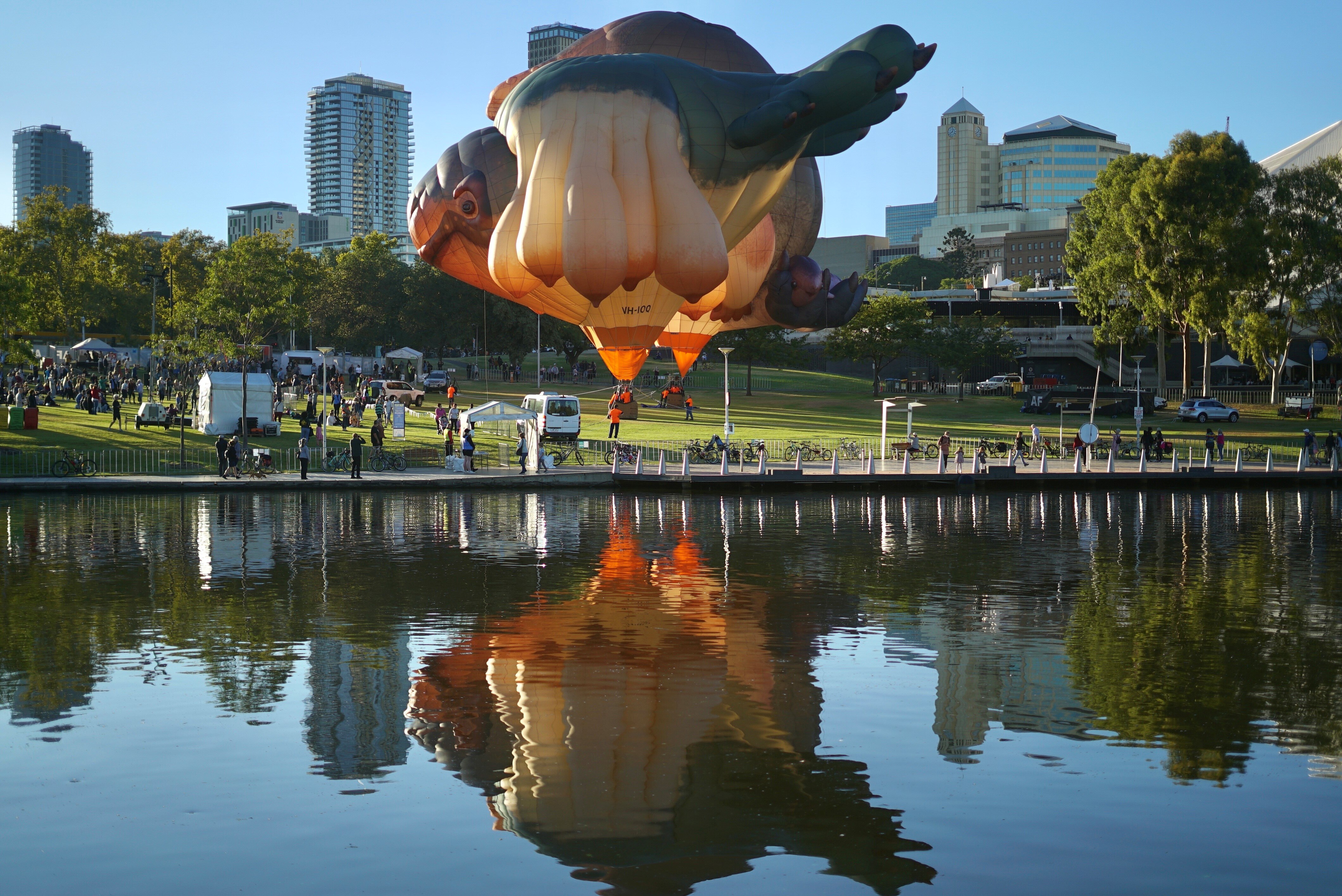 The renowned hot air balloon Skywhale was inflated above the River Torrens, along with newly created partner Skywhalepapa and babies, as part of the Adelaide Festival.