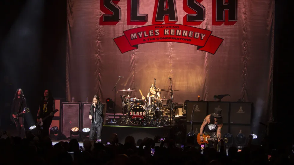 People will never get sick of seeing Slash on stage. Even though it was just six months ago that the guitar hero was melting faces at Wrigley Field as part of Guns N’ Roses’ five-years-running reunion tour, that didn’t stop legions of fans from clamoring to see him again Wednesday night at the more intimate confines of the Riviera. This time it was for a taste of the phenom’s solid solo project featuring Myles Kennedy and the Conspirators, in support of the troupe’s acclaimed new album “4,” with GNR on the backburner for the evening.