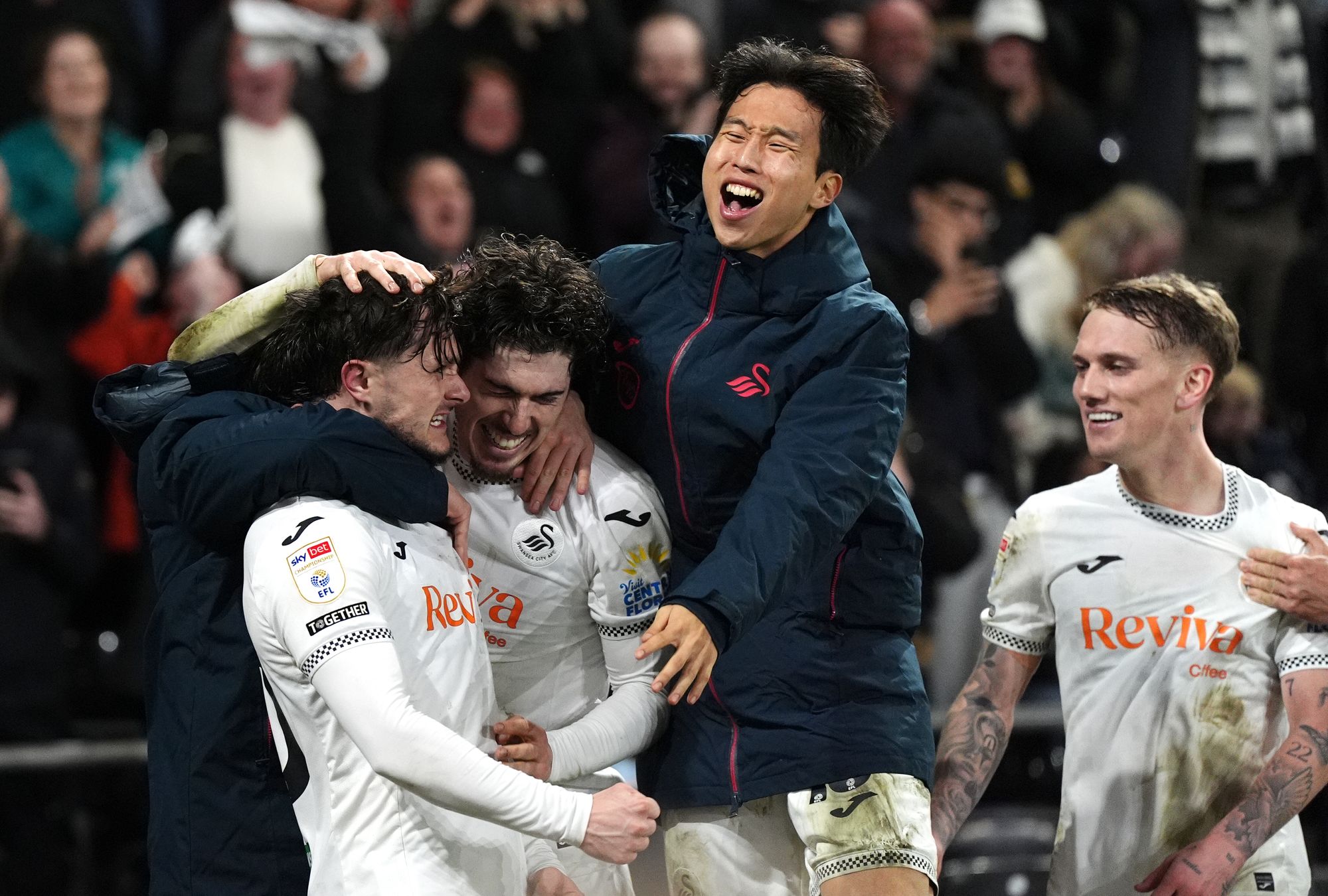 But Cullen headed home in the fifth and final minute of added time, sparking wild scenes in front of a record crowd at the Swansea.com stadium, and celebrations by the American rapper, the clubs co-owner, too.