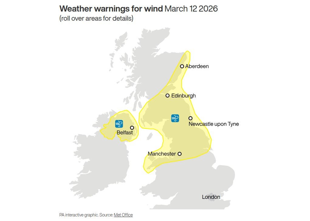 On Thursday, a yellow warning of wind is in place for central, southern and north-eastern Scotland, as well as the north of England. A separate yellow warning for wind is in place for Northern Ireland.