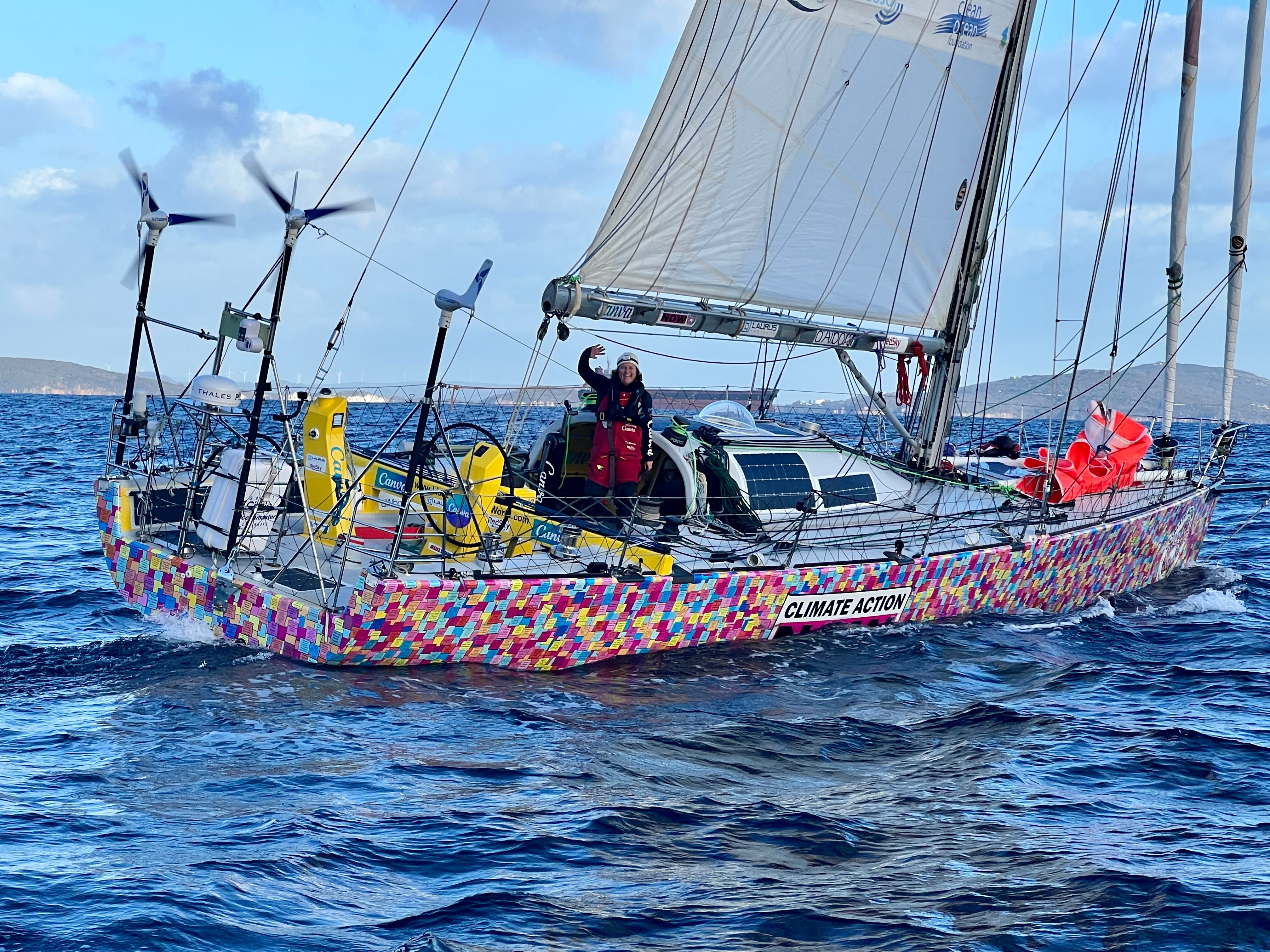 Her vessel, named Climate Action Now, is decorated with positive climate actions submitted by the community, and throughout her journey, she has collected microplastic samples and meteorological data to assist with global weather monitoring.
