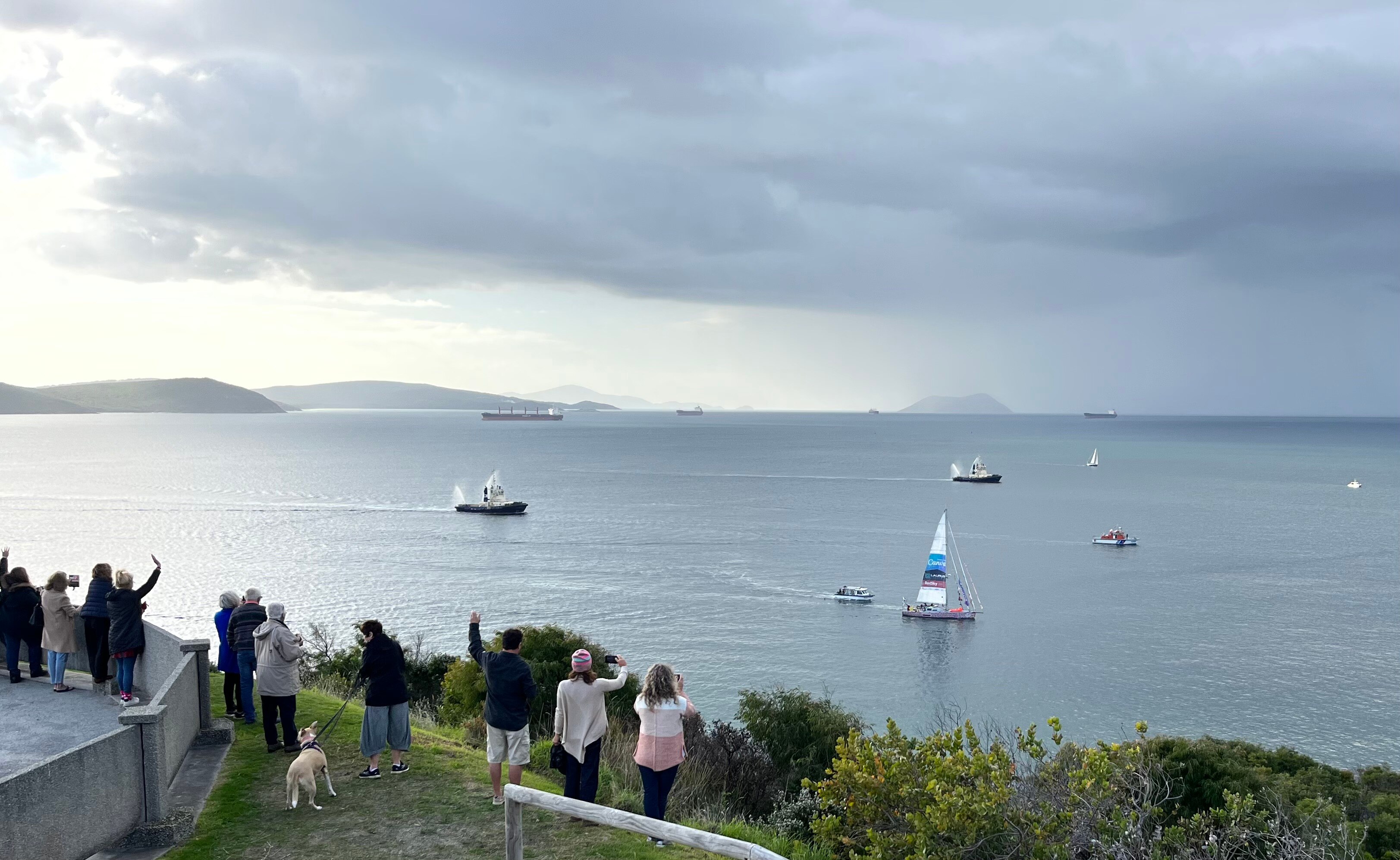 Hundreds of well-wishers gathered along Albany's coastline and marina, cheering, holding sings and honking car horns in celebration of the record holder's arrival.