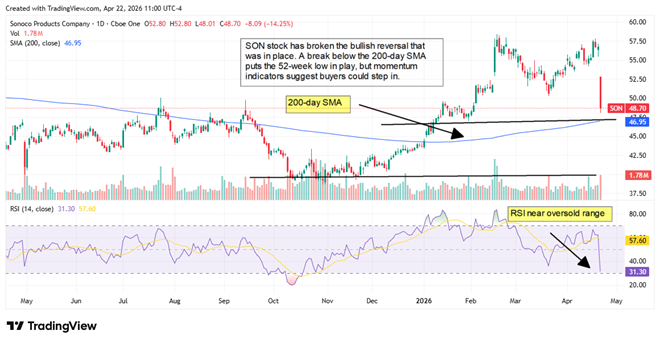 SON gapped down after the earnings miss, but that shouldn’t have been a big surprise. The stock was trading near its 52-week high in the weeks before earnings, which made the report a make-or-break moment.