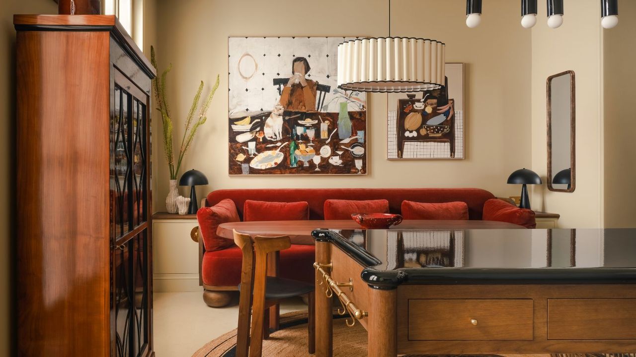 A cozy, eclectic dining area featuring a plush red velvet banquette against a beige wall. A large abstract painting of a dinner scene hangs above the table, flanked by modern black table lamps and a tiered white pendant light.