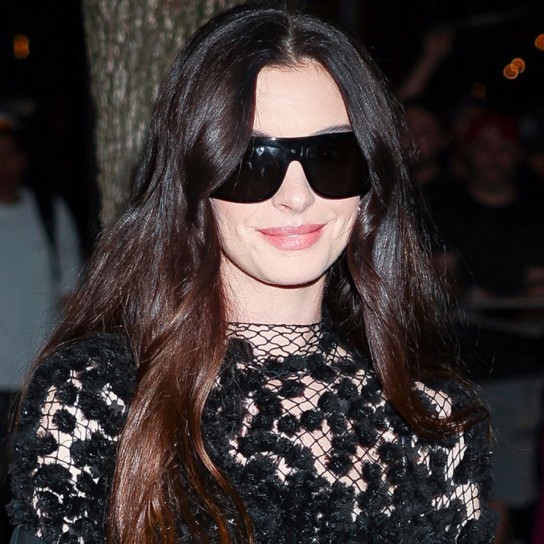 Then, Hathaway's creative liberties began with a black Valentino blazer, shield Khaite sunglasses, pointy Dolce & Gabbana pumps, and last but not least, the Longchamp Le Roseau bag.