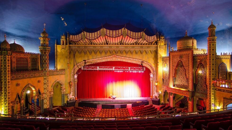 The auditorium, where the main stage is, has about 2,300 velvet seats in rows across the first floor and balcony. The awning above the stage evokes a circus tent, giving people the impression they are camped out under the stars.