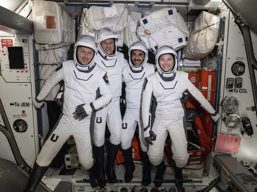 The three U.S. astronauts and one German in the capsule were bobbing off the Florida coast, near Tampa, less than 24 hours after leaving the International Space Station. NASA expected to have them back in Houston later in the morning.
