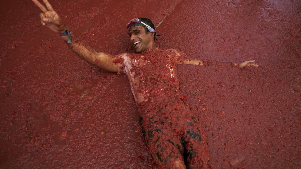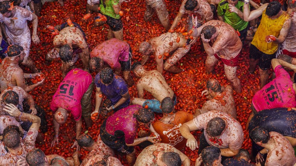 BUÑOL, Spain — People from around the world pelted each other with tomatoes as Spain’s famed La Tomatina street tomato fight returned after a two-year suspension because of the coronavirus pandemic.