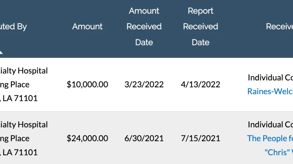 Months later, on March 23, the Shreveport hospital made the $10,000 contribution to Welch’s wife, campaign-finance records show.