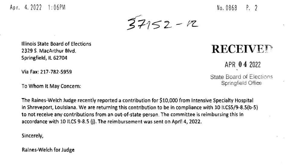 “To Whom It May Concern: The Raines-Welch Judge recently reported a contribution for $10,000 from Intensive Specialty Hospital in Shreveport, Louisiana. We are returning this contribution to be in compliance with 10 ILCS5/9-8.5(b-5) to not receive any contributions from an out-of-state person. The committee is reimbursing this in accordance with 10 ILCS 9-8.5 (j). The reimbursement was sent on April 4, 2022.”