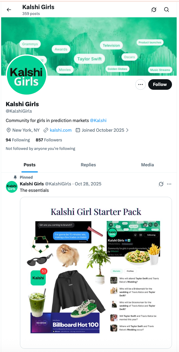 Over on @Kalshigirls, the profile’s pinned post is a tongue-in-cheek “Kalshi Girls Starter Pack,” which includes an iced-matcha beverage (a Gen Z staple), a Van Cleef & Arpels bracelet, text messages about being late for brunch due to “making trades,” and a Kalshi-branded hoodie.