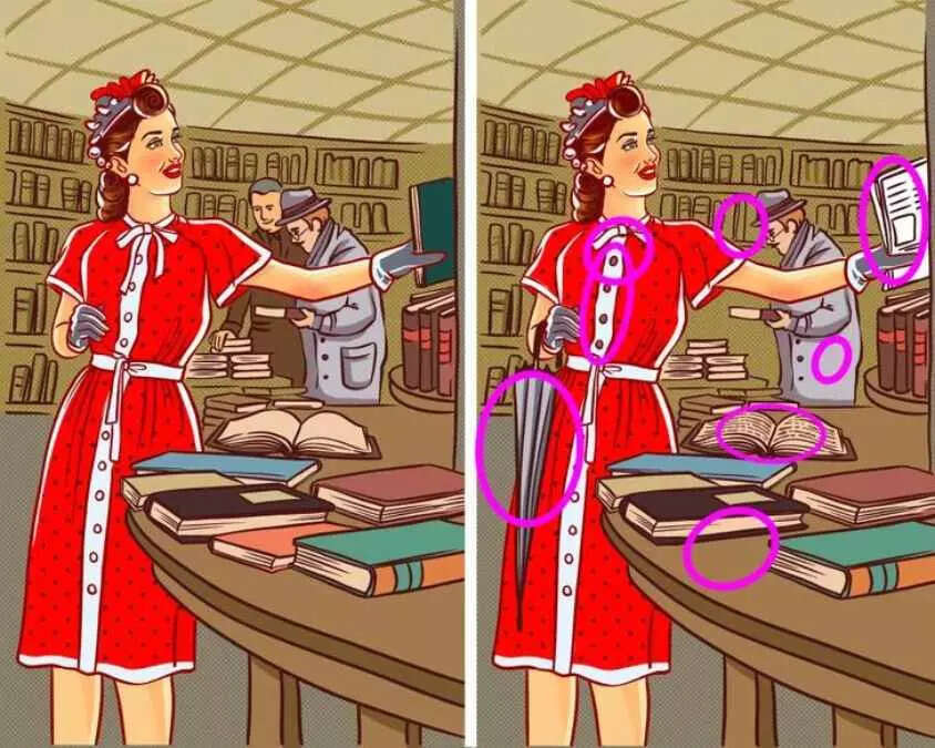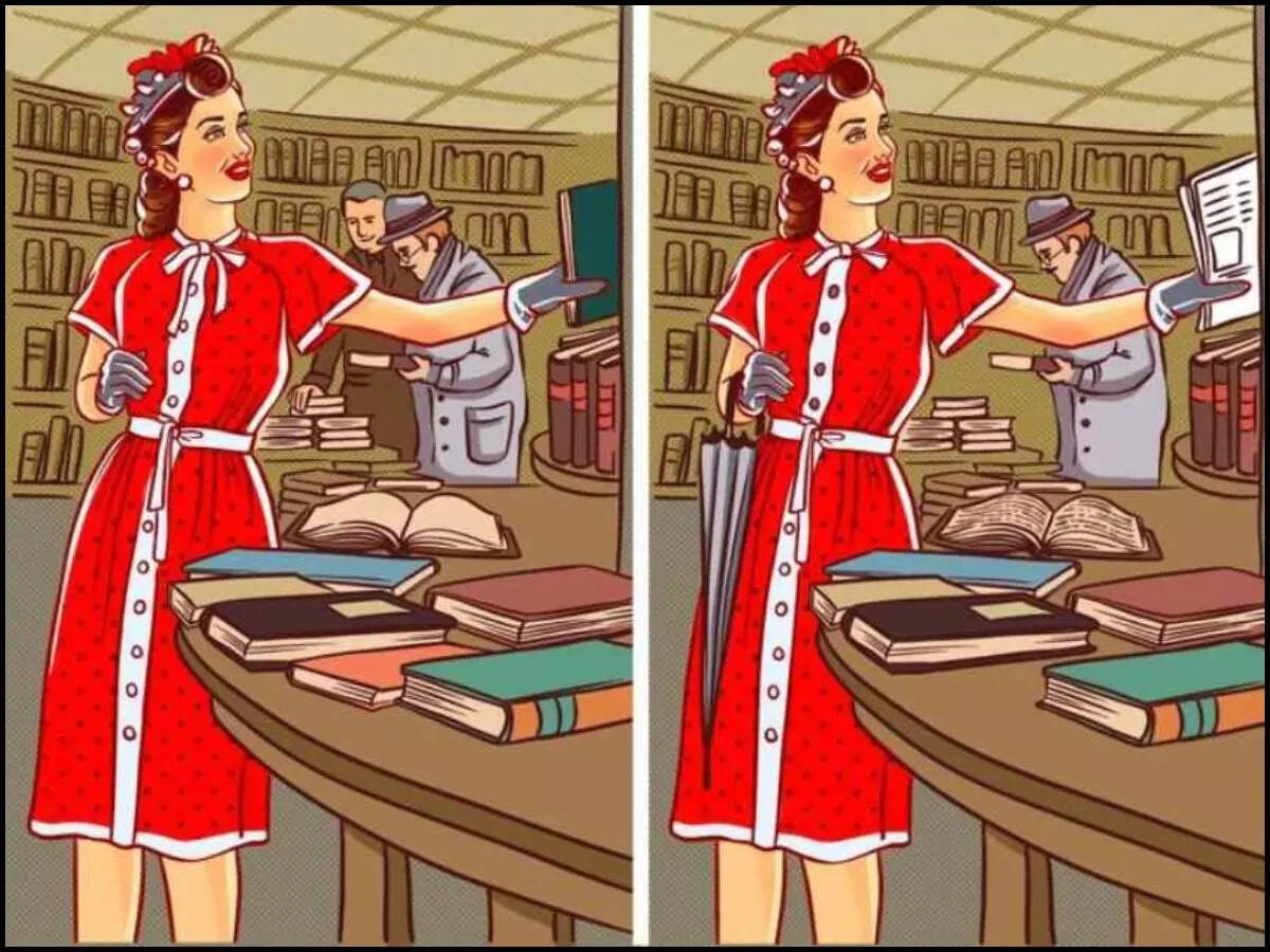 The image above depicts an old era where a woman is finding books in a library. See if you can find the differences in under 30 seconds!