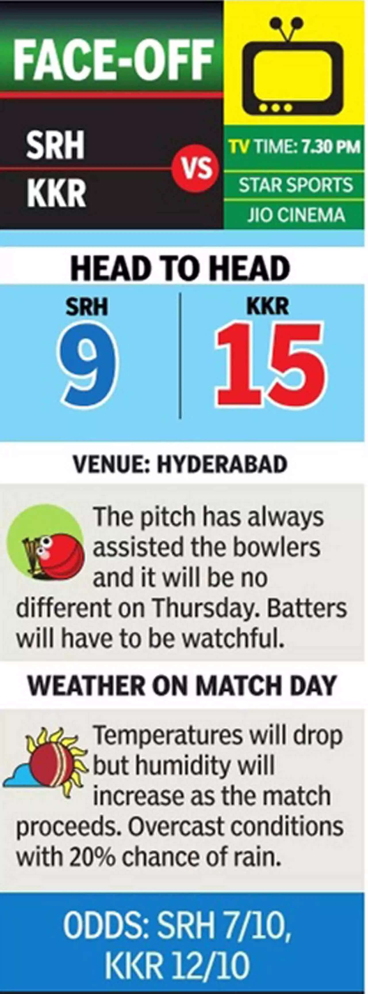 Like SRH, Kolkata have blown hot and cold. They have lost five of their last six games and Rinku Singh's heroics against Gujarat Titans in Ahmedabad seem so long ago. The two-time champions also have six points and will look to improve their playoff chances.