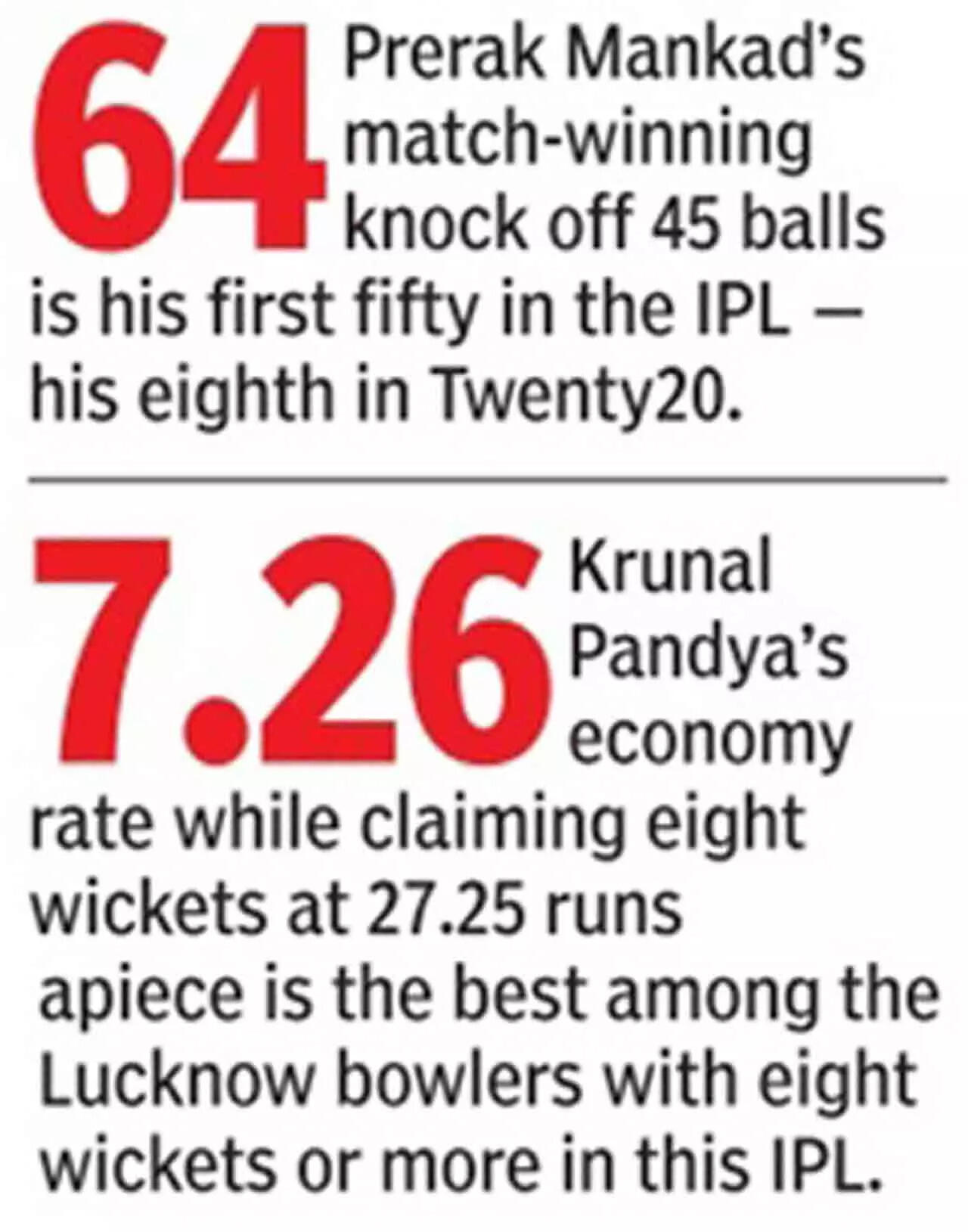 LSG made a quiet start but Prerak Mankad played a calculated knock and at 185/3 took his team to a seven-wicket win. His unbeaten 64 (45b; 4x7, 6x2) and the 73-run stand for the third wicket with Marcus Stoinis (40; 25b, 4x2, 6x3) took them within striking distance at 114/2 after 15 overs. LSG needed 69 from the last five but Abhishek Sharma's 16th over proved disastrous.