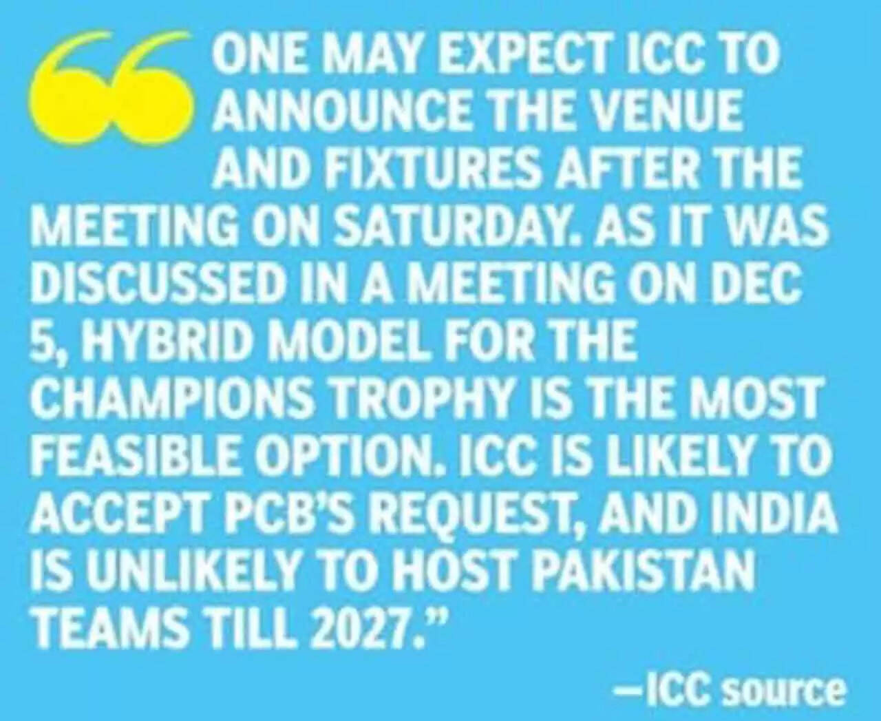 During the upcoming Champions Trophy, Dubai is set to be the venue for the final with Pakistan hosting 10 matches and a semifinal. "One may expect ICC to announce the venue and fixtures after the meeting on Saturday. As it was discussed in a meeting on December 5, hybrid model for the Champions Trophy is the most feasible option. ICC is likely to accept PCB's request, and India is unlikely to host Pakistan teams till 2027," an ICC source told TOI on Friday.
