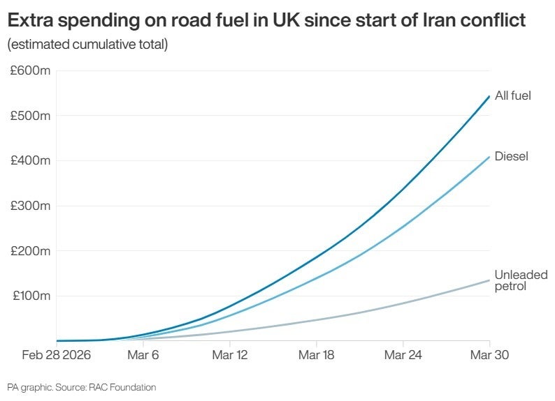 RAC figures on Tuesday showed average diesel prices at UK forecourts were 182.8p per litre, up 40p since the start of the conflict, which brought the cost of filling up a 55-litre family car to £100.52.