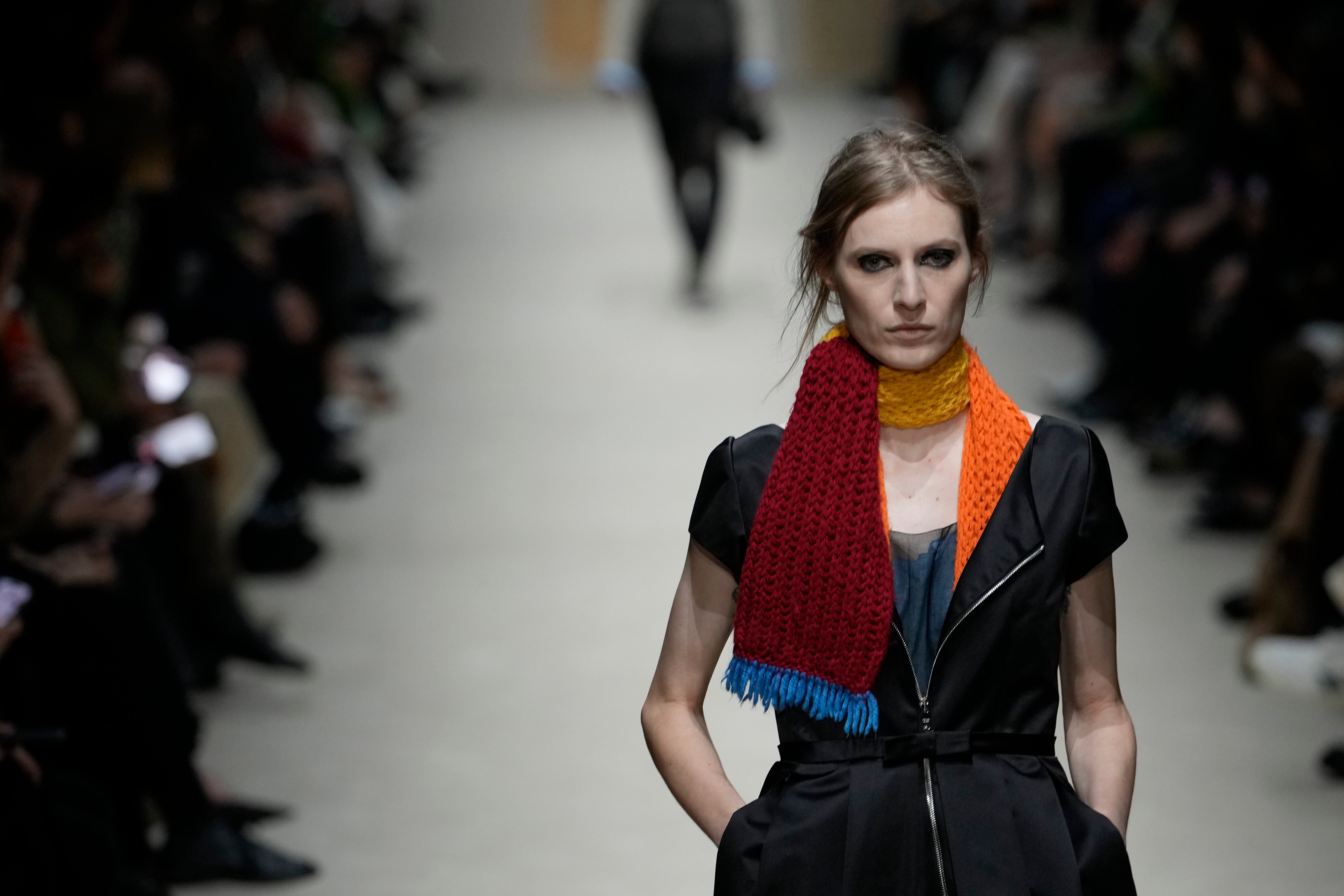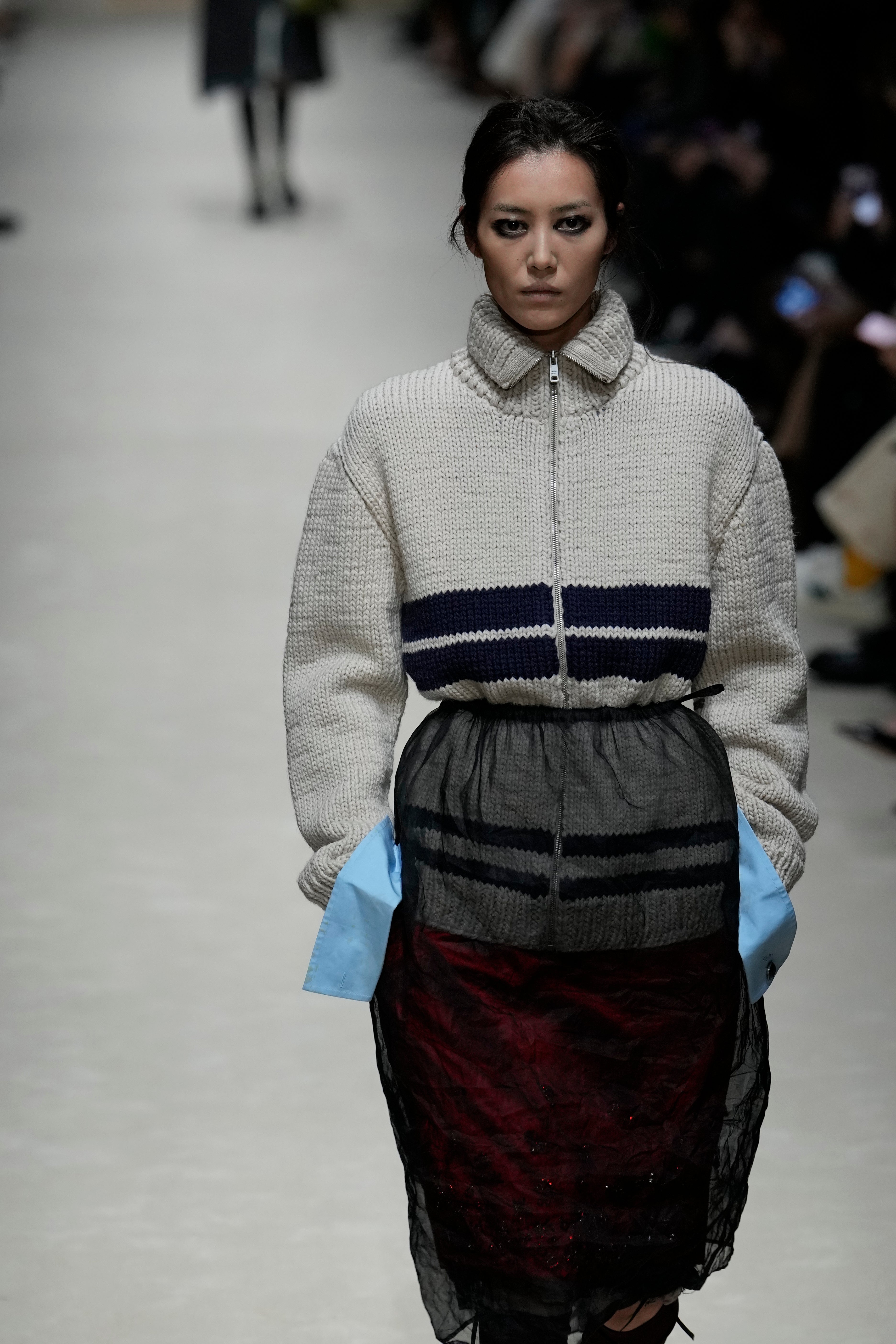 Among this show’s styling were echoes of the brand’s younger sibling, Miu Miu, particularly in the shorter hemlines, knee socks and subtly awkward-but-cool proportions.