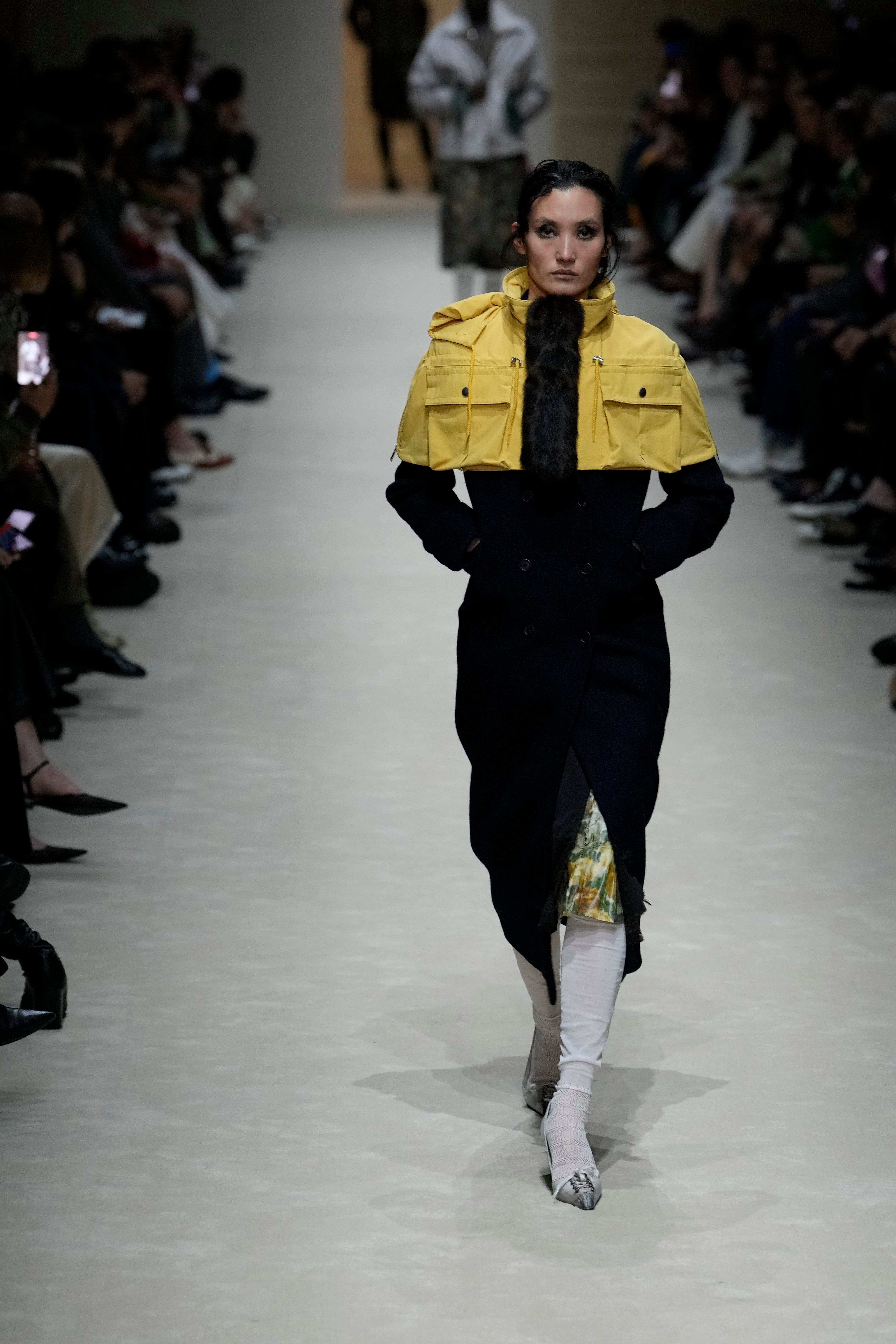 Elsewhere, a grey utility jacket was thrown over a floral knee-length skirt with an evening clutch, reinforcing Prada’s ongoing fascination with the tension between refinement and functionality.