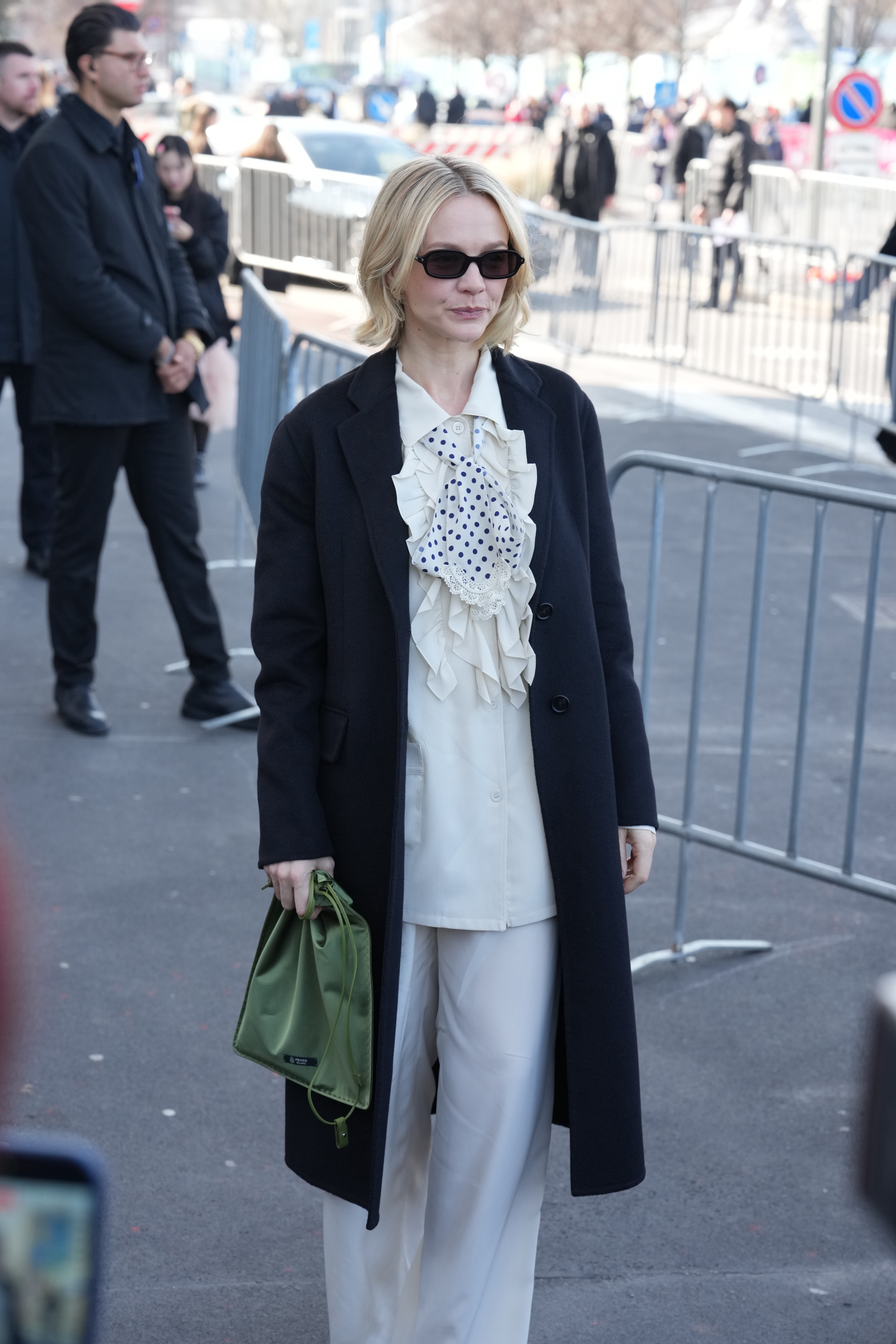 While Hadid was walking on the runway, stars were also sitting front row, including actress Carey Mulligan, 40, an ambassador of the label – who recently wore a fluid satin navy blue slip dress on the BAFTA red carpet – wearing a cream ruffled blouse and polka dot cravat with a black overcoat.