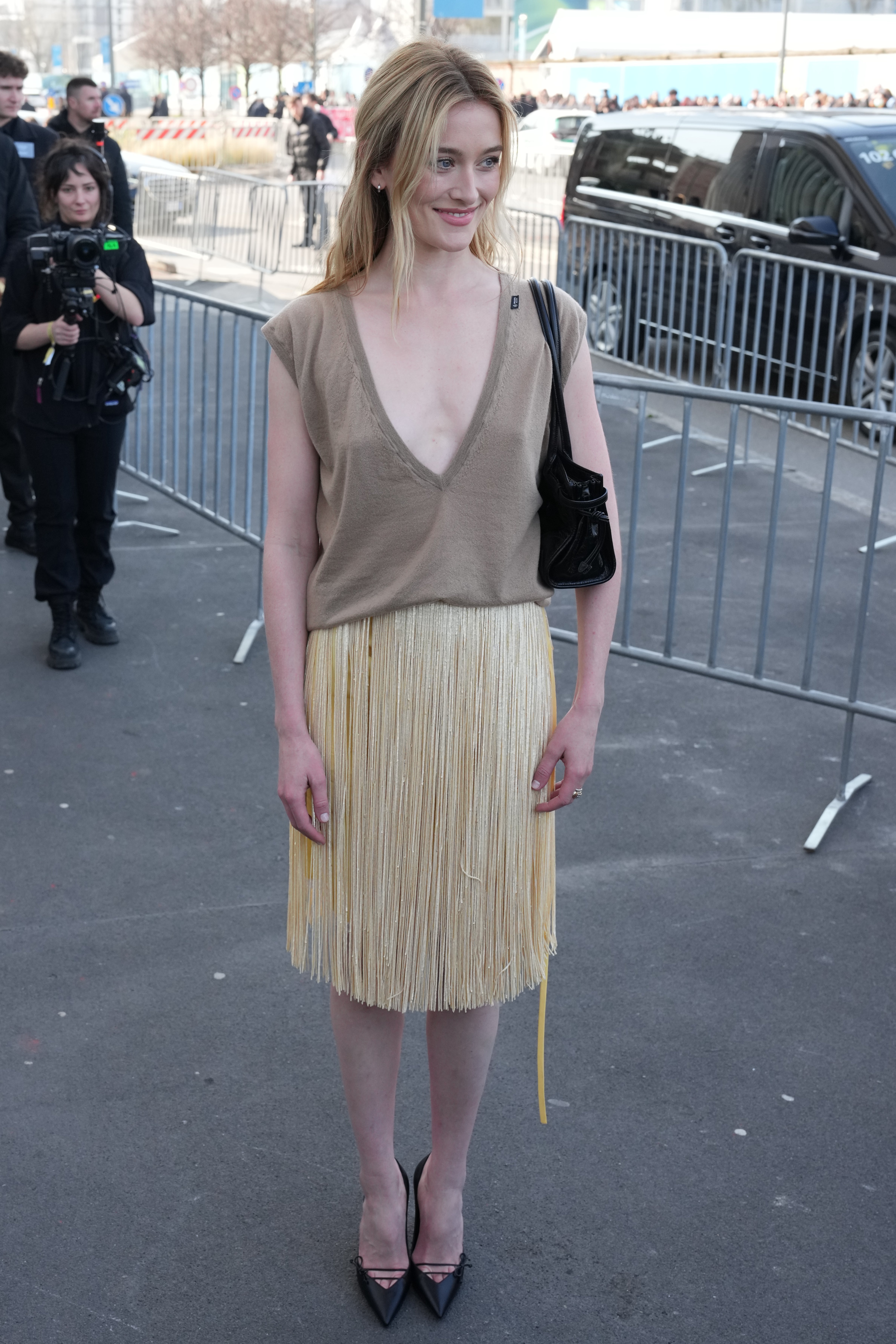 Fellow actress Sarah Pidgeon, 29, who recently inhabited the role of Carolyn Bessette-Kennedy in FX’s Love Story also stepped out in a loose V-neck taupe sweater vest and a knee-length, butter yellow fringed skirt.