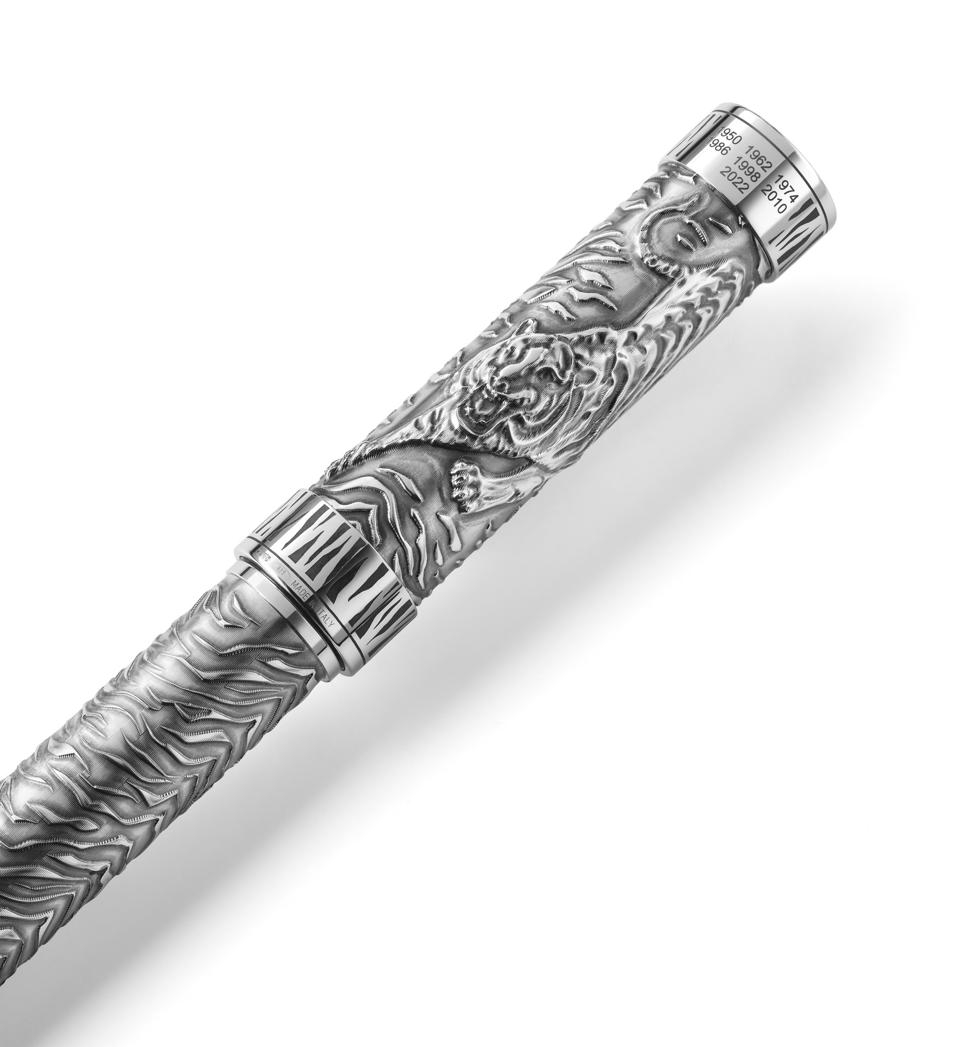 This Year of the Tiger limited edition of 100 sterling silver fountain pens is another beautiful example of one of Montegrappa’s artisanal strong suits: engraving. Master artisans at the company’s Bassano del Grappa manufactory employ varying depths of engraving to animate the stunning animal decorating the cap of the pen; equally exquisite engraving suggesting the animal’s coat embellish the barrel. The pen’s custom clip is whimsically inspired by the tiger’s tail, and antiquing is artfully applied to accentuate the animal’s characteristic striping.