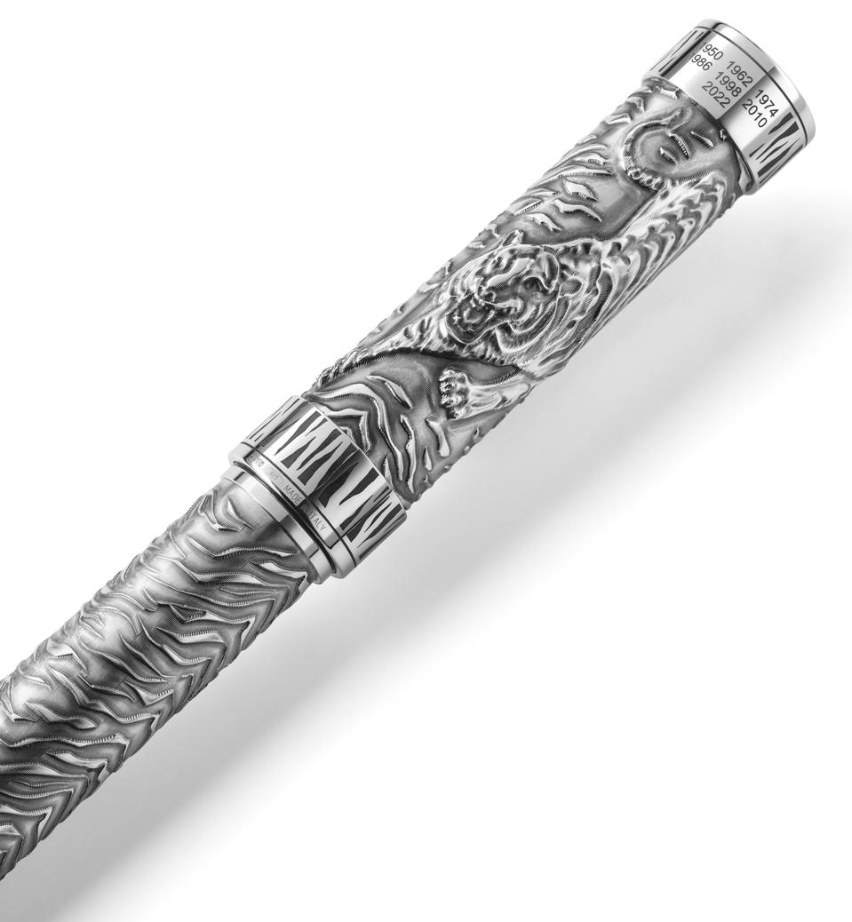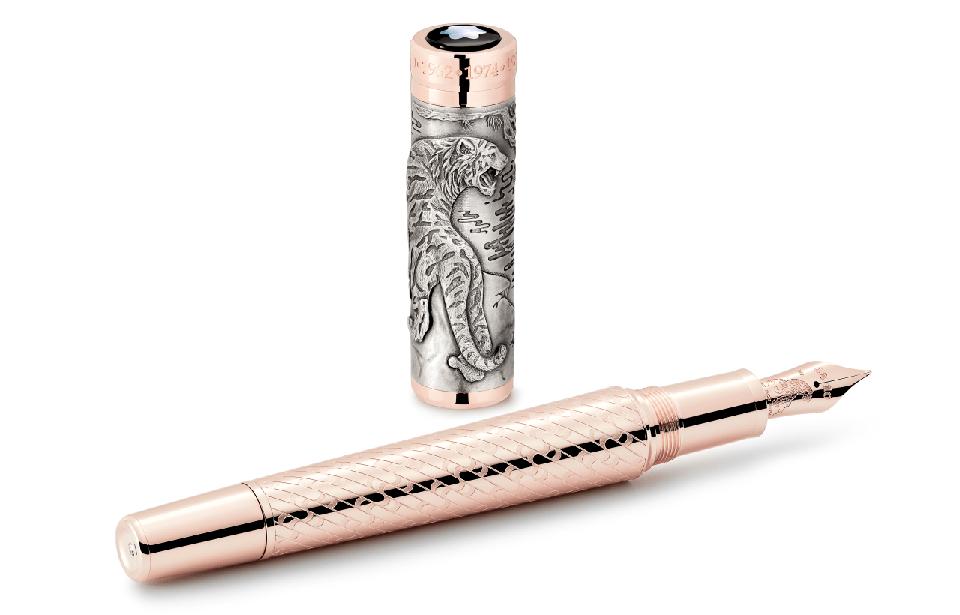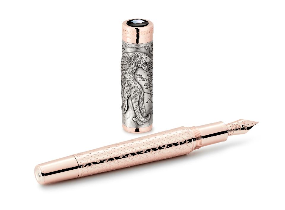 The current Year of the Tiger, 2022, is engraved on the cap ring, along with the six previous years of the tiger. The cap is crowned with the Montblanc emblem in mother-of-pearl. The handcrafted rose-tone 18-karat gold nib is engraved with the majestic tiger standing on a rock.
