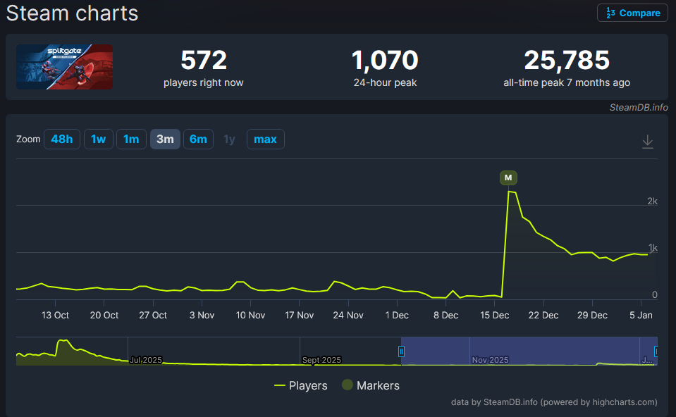 Splitgate: Arena Reloaded, a reimagined game that launched on the base of Splitgate 2, saw a relatively mild reception last month, with Steam playercount never reaching satisfactory numbers and dwindling further.