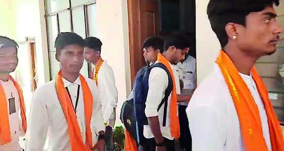 In Belagavi, a group of students from government PU college in Ramadurga town came to class with saffron shawls