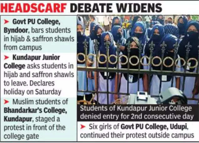 On Friday, Government PU College in Byndoor, Udupi district, barred girls wearing hijab from entering the campus. This is the 5th college in the district — three in Kundapur, one in Udupi and one in Byndoor — to witness a row over hijab.