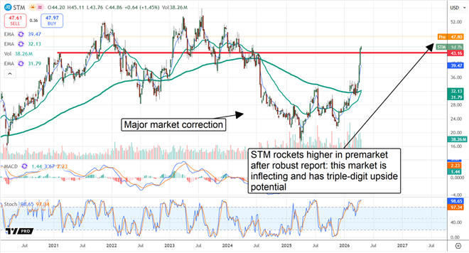 The chart action speaks for itself. The market underwent a massive correction beginning in 2024 and has only now recovered. The price action in April set a long-term high, breaking above the critical resistance point, signaling a shift in market dynamics. In this scenario, the STM stock price can rally an amount equal to the correction’s dollar value, about $25, in the near-to-mid-term, and by its percentage gain in the long term.
