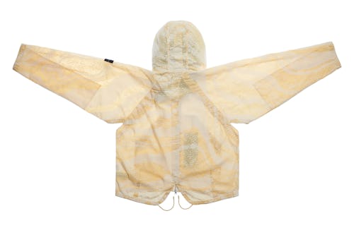 Using “stretch broken” technology and Kevlar’s precise filaments, the fabric’s inner yarn is extremely fine and covered in cotton. The outer material is then constructed using a dévoré printing technique, which disintegrates the cotton yarn to create an all-over pattern. The result is a yellow, technical lace with added texture thanks to a final resin treatment.