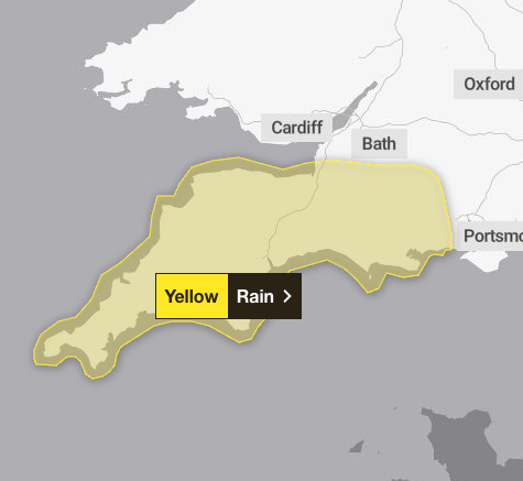 The Met Office says: : ”A band of rain will arrive across Cornwall on Thursday afternoon then move northeast across the warning area through the evening and clearing during early Friday.