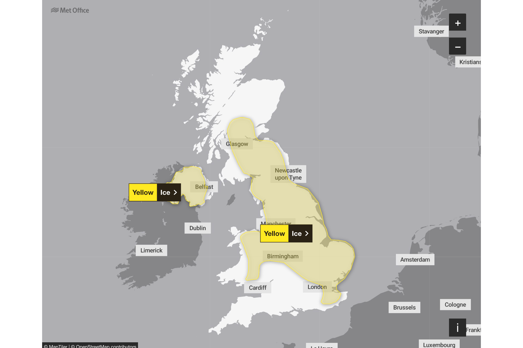 There are two yellow warning issued for ice in parts of Northern Ireland and another affecting central England, the East Midlands, the east of England, London and South East England, North East England, North West England, Scotland and Lothian borders, Strathclyde, Wales, West Midlands, and Yorkshire and Humber.
