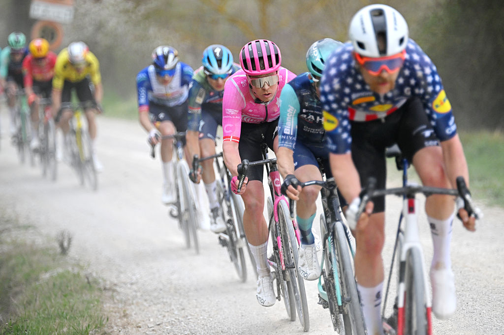 It was a fast start to proceedings on a mild and dry day in Tuscany, and it took some 40km and three gravel sectors for a breakaway to form.