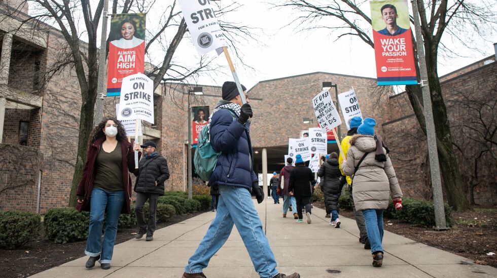 Hundreds of faculty at the University of Illinois Chicago hit picket lines across their Near West Side campus Tuesday on the first day of an indefinite strike after nine months of contract negotiations.