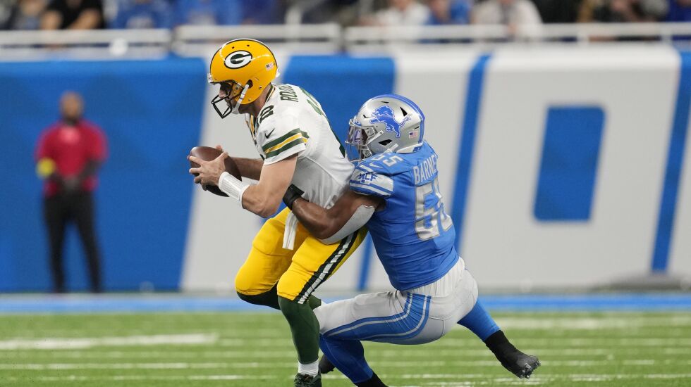 Rodgers threw interceptions in the end zone on his first two possessions. Kerby Joseph picked off the first one on a deflected pass and Aidan Hutchinson intercepted the next on a fourth-down pass toward left tackle David Bakhtiari.